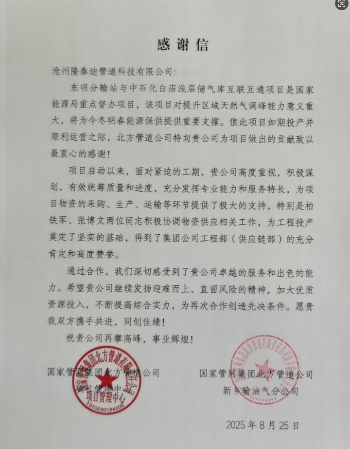 信任與鞭策— 一封來自國家管網建設項目現場的感謝信